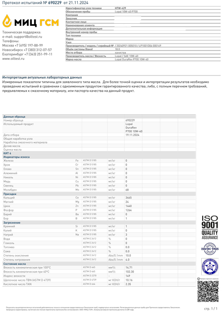 Результаты лабораторных испытаний свежего LOPAL DuraRev P700 10W-40 подтверждают заявленный класс SAE 10W-40 по вязкости и демонстрируют типичный для CI-4 уровень щелочного резерва с учётом различия методов измерения (D2896 vs D4739). Важным моментом является отсутствие загрязнений и износных элементов, что позволяет рассматривать полученные значения как корректную исходную точку для дальнейших сопоставлений и оценки рецептуры.