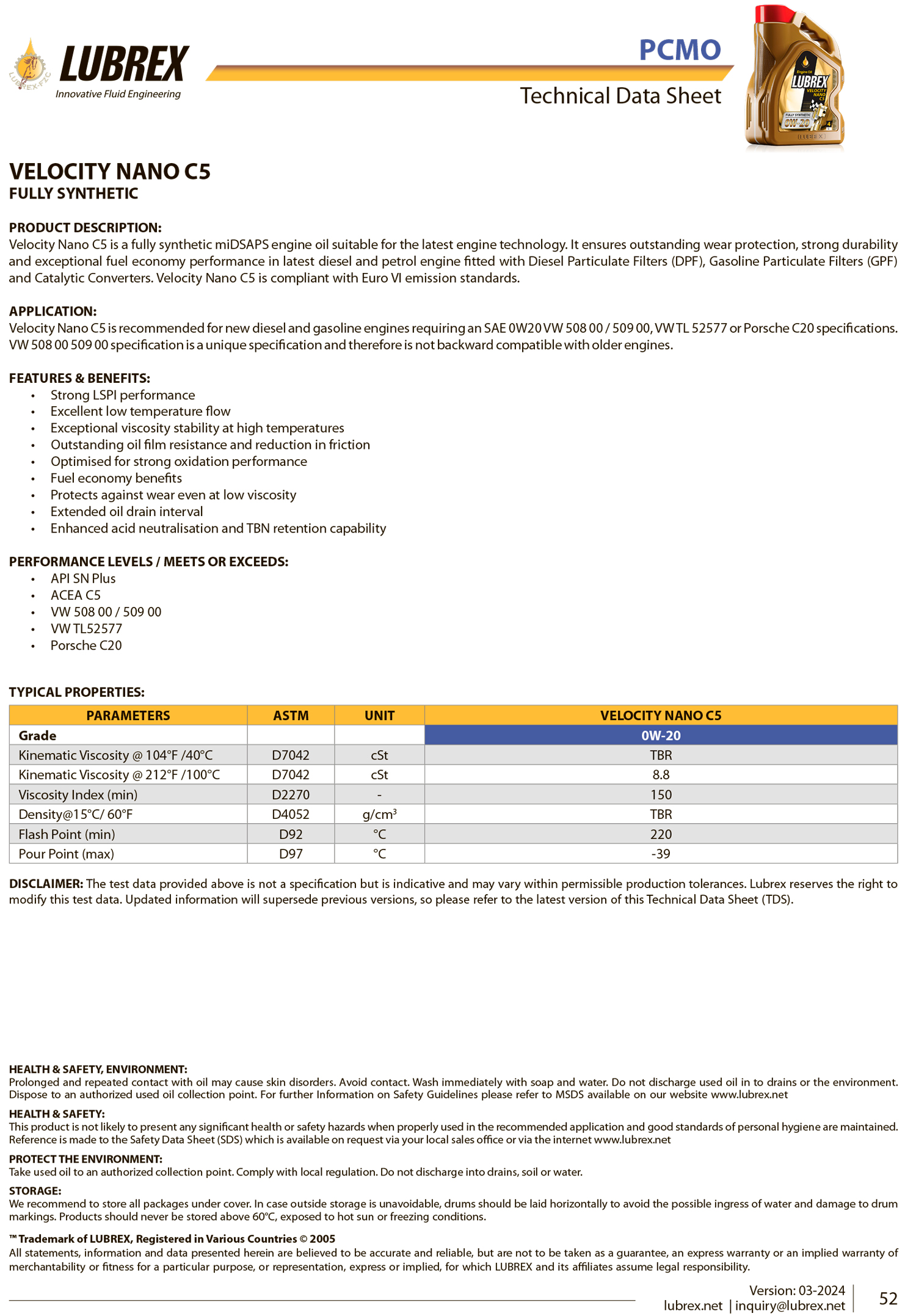 В паспортных данных для масла Lubrex Velocity Nano C5 0W-20 заявлены соответствия спецификациям VW 508 00 / 509 00, VW TL 52577 и Porsche C20.