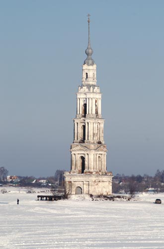 Это колокольня Николаевского собора, затопленного в 30е годы. Находится она на острове, а с берега к ней ведет булыжная мостовая... Правда, часть ее глубоко под водой. Зимой этого, конечно, не видно. Зато при желании к колокольне можно подъехать даже на машине прямо по льду. А уж снегоходов тут - видимо не видимо.