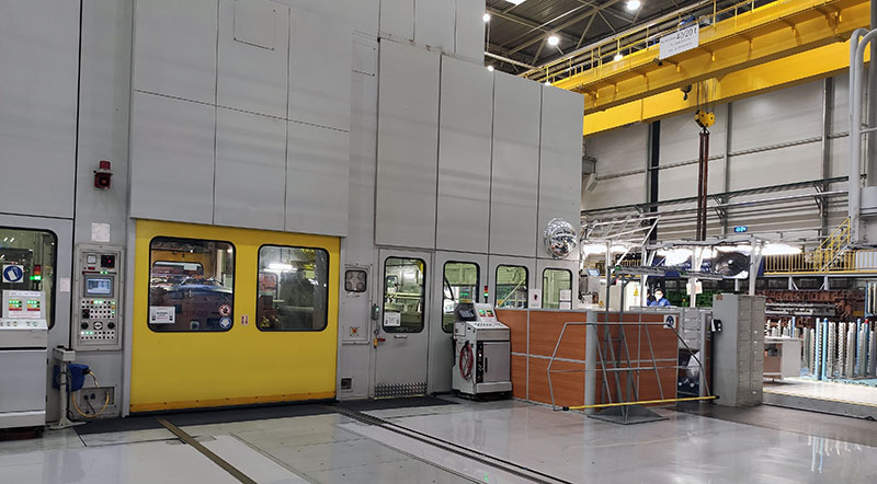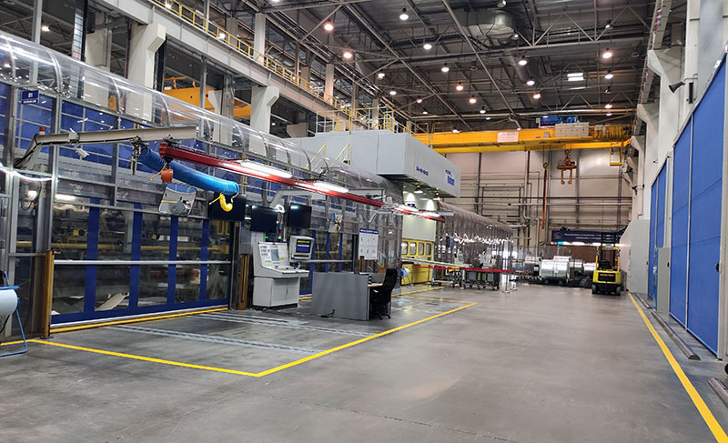 Производство автомобиля начинается с металла – с получения проката и подготовки его к процессу изготовления кузова. На завод Hyundai Motor металл приходит в рулонах, первая стадия его подготовки – очистка, выправка и нарезка под шаблоны для штамповки. Линия подготовки расположена с левой стороны кадра, а справа – закрытые от пыли полки промежуточного склада.