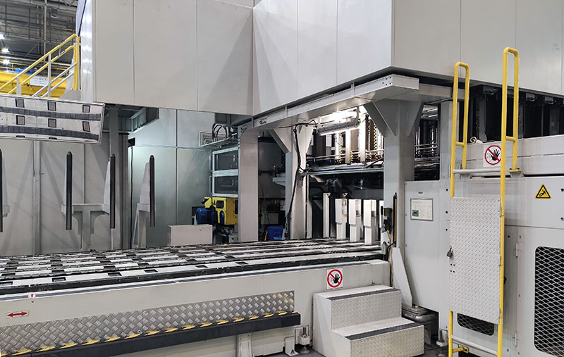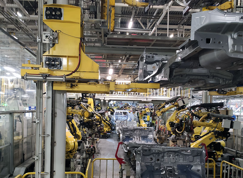 Видно, как манипулятор робота перемещает готовую боковую часть кузова с линии сварки боковин.