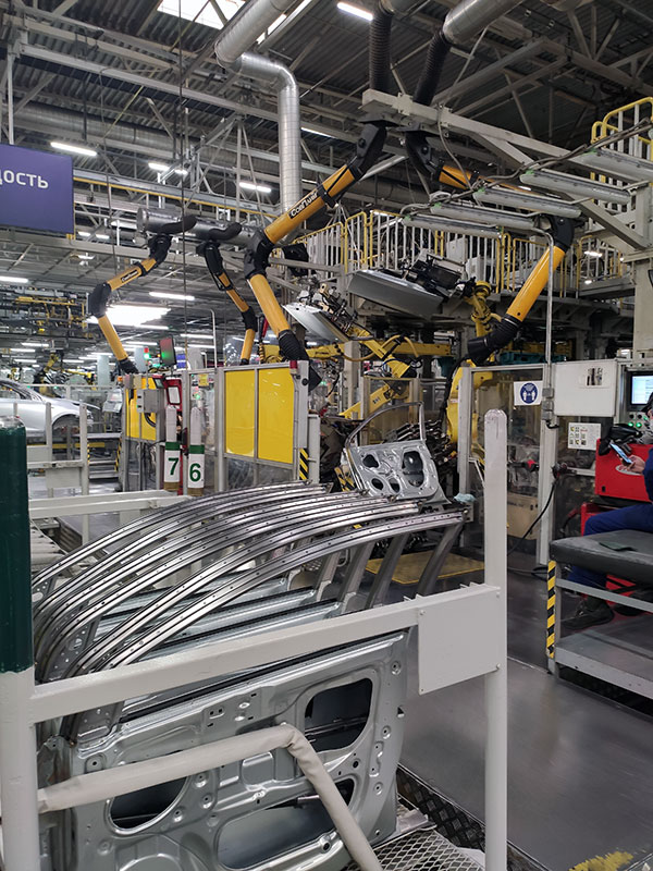 Затем детали попадают на роботизированную линию сварки. На фотографии запечатлен небольшой участок, где сваривают двери.