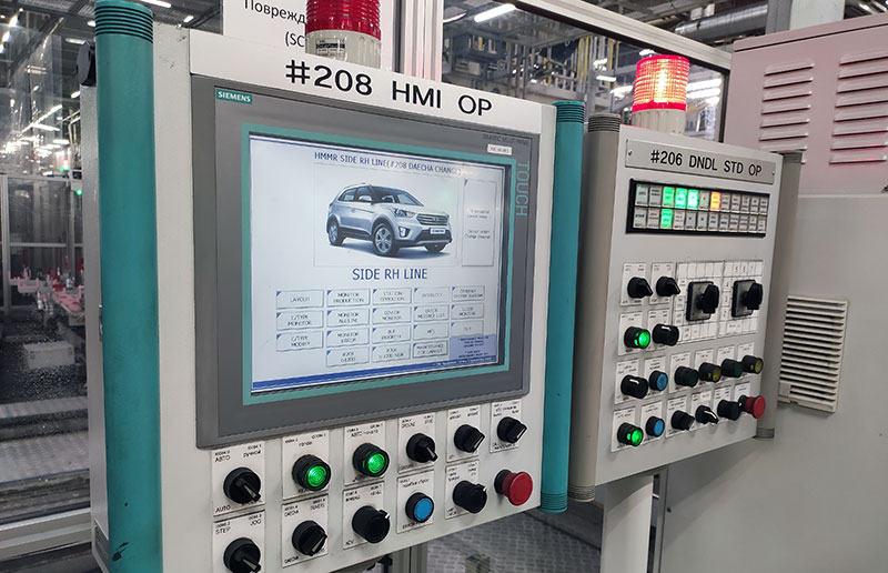 Блок управления линией сварки. Хорошо видно, что сейчас идет работа над кузовом Hyundai Creta.