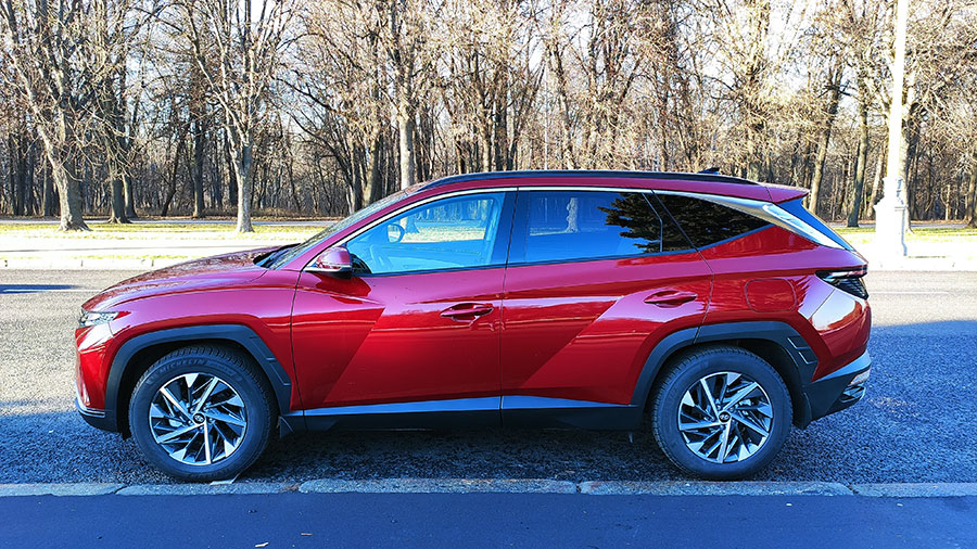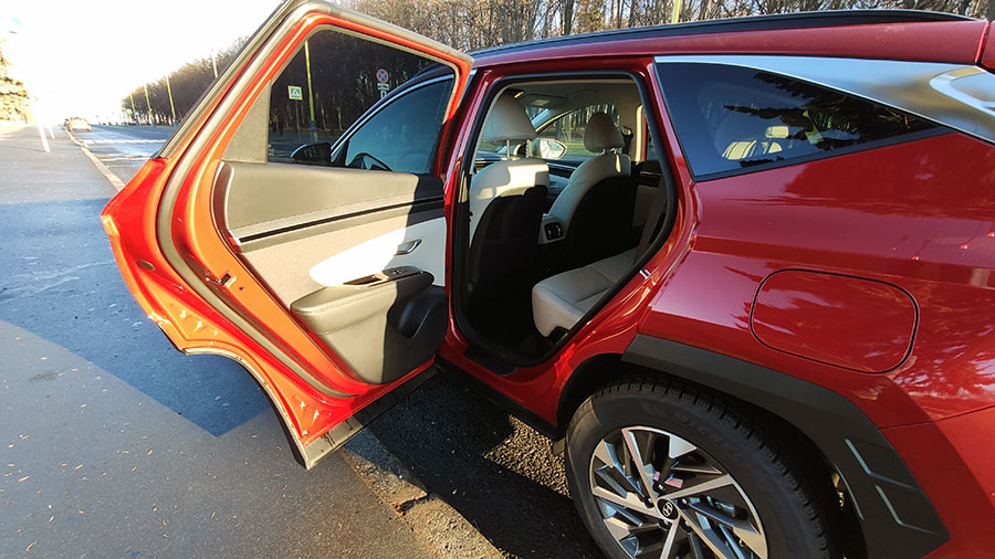 Второй момент – использование резких прямых изломов в штамповке кузовных деталей. Наиболее выразительное воплощение такого дизайнерского подхода можно увидеть в Hyundai Elantra, которая также была недавно на тесте журнала «АвтоДела». В ней общая концепция строгих геометрических линий бросается в глаза при первом взгляде на кузов машины. В Hyundai Tucson 2022 эта концепция реализована скромнее, но тем не менее присутствует – в виде линий перехода штампов с крыльев на двери, а также в рельефе боковых поверхностей дверей. Данное художественное решение визуально объединяет модельный ряд.