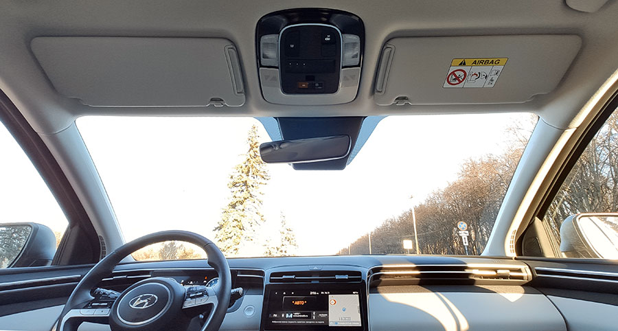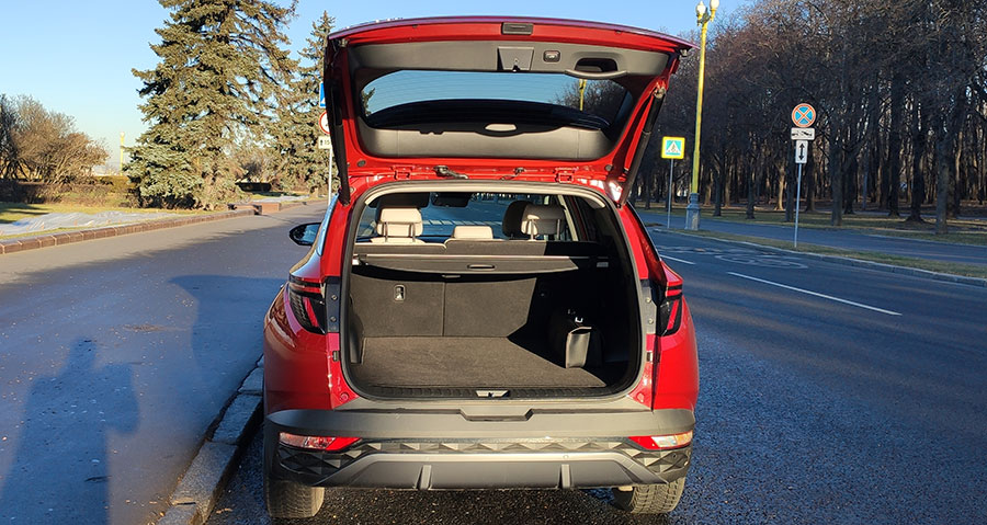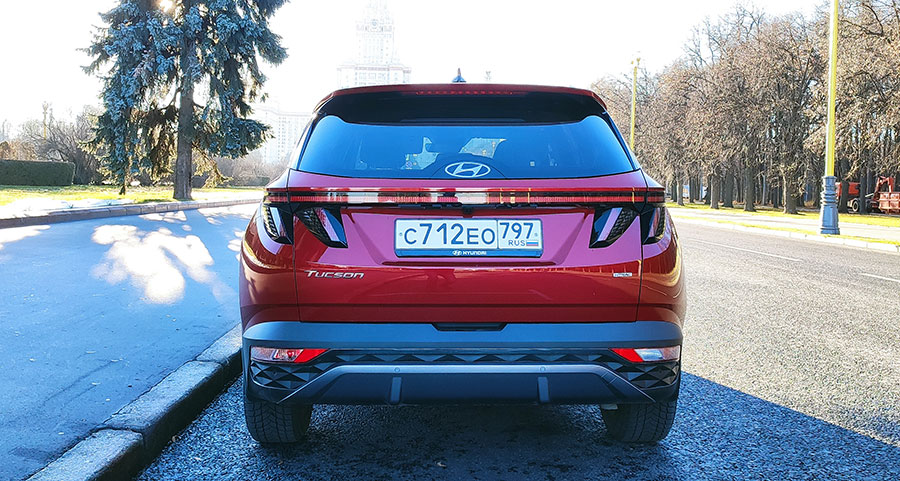 На дороге Hyundai Tucson 2022 ведет себя адекватно и предсказуемо. Завяленных 149 л.с. вместе с шестиступенчатой АКПП отлично хватает для всех режимов вождения автомобиля, будь то город или трасса. Приемистость и уверенное движение приятны как для водителя, так и для пассажира. Машина очень тихая, и к этому моментально привыкаешь. Настройка подвески мне показалась упругой, так как большую часть времени ездил в машине одни. По асфальту мягко перекатываются низкопрофильные шины 235/60 R18, надетые на темно-серые литые диски сложной звездчатой формы. Благодаря оригинальной форме ДХО автомобиль узнается в потоке и привлекает внимание.