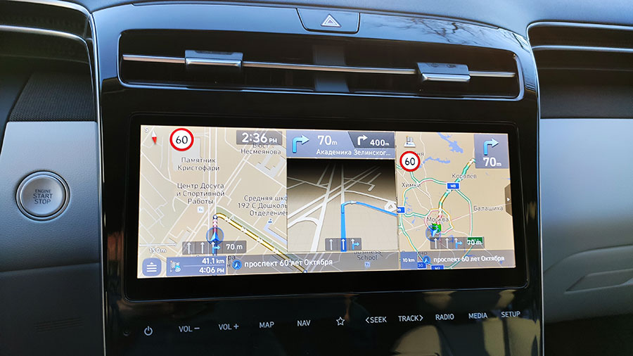 Дальнейший осмотр внутреннего убранства машины, при прочих равных, выявляет несомненные плюсы QX 50 как в функциональности, так и в качестве. При этом торпеда Infiniti проигрывает в универсальности Hyundai за счет того, что в последней нет стрелочных приборов, а используется большой дисплей, что делает его более универсальным. Однако те интересные фишки, которые реализованы в функционале дисплея Hyundai Santa Fe, в Tucson не завезли, что снижает разницу между классической приборной панелью и дисплейной. Несомненно выигрышно у корейца смотрится мультимедийный дисплей, который отвечает за настройку системы и навигацию. Причем навигация сделана по-современному и очень удобно. На одном экране располагаются несколько изображений карты разного масштаба, что позволяет быстро оценить обстановку и сориентироваться на дороге. Это очень передовое решение, на фоне которого стандартное навигационное окно QX 50 выглядит архаично.