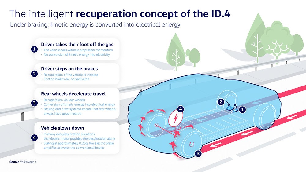 Рекуперация энергии торможения, или регенерация энергии при замедлении, существенно увеличивает запас хода любого электромобиля. В новой модели Volkswagen ID.4 данная концепция нацелена на обеспечение максимальной энергоэффективности.