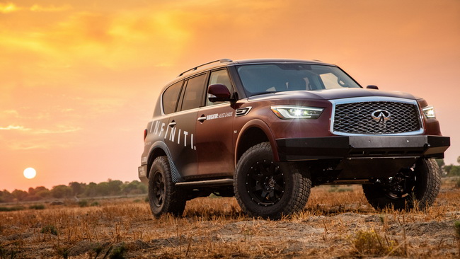 Подготовка QX80 к изнурительному испытанию была доверена специалистам калифорнийской офф-роуд фирмы CALMINI Products, Inc.: на автомобиль установили лебедку, усилили элементы подвески, установили сделанные на заказ передний и задний бамперы с улучшенными показателями геометрической проходимости и зубастые шины.