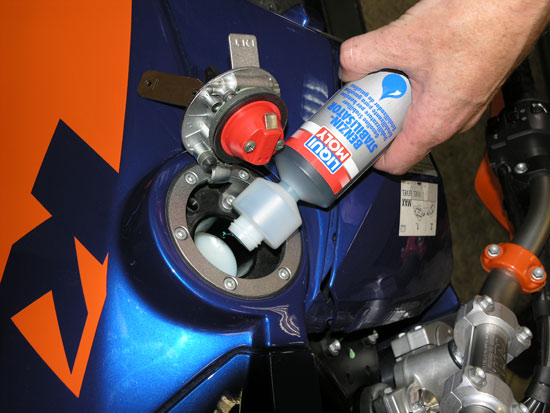 - Во первых, необходимо полностью заполнить бак мотоцикла топливом, предварительно добавив присадку LIQUI MOLY Ventil Sauber (артикул 1989) в необходимом количестве. После чего завести двигатель и проехать 30-50 км для очистки деталей от нагара, затем еще раз долить топливо. Нагар имеет свойство отслаиваться при хранении и оставлять задиры на поверхностях цилиндропоршневой группы.
