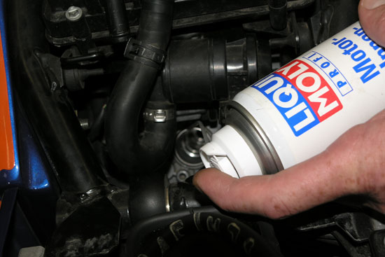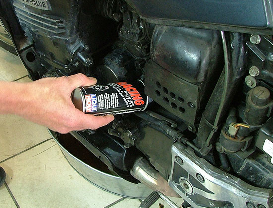 Для консервации двигателя на четырехтактном мотоцикле в каждый цилиндр через свечное отверстие разбрызгивается LIQUI MOLY Motor Innerkonservierer.