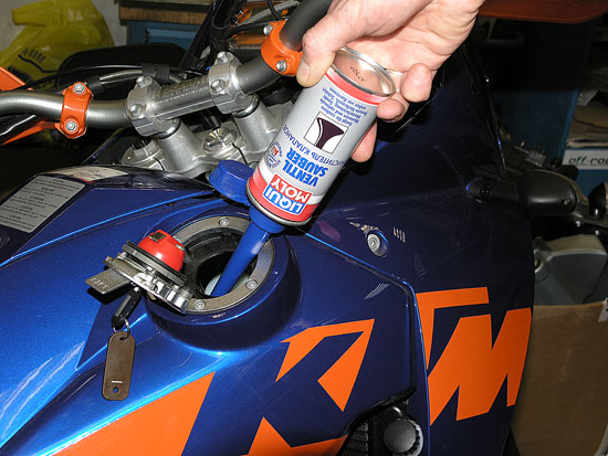 На 4-х тактном мотоцикле сперва выворачиваются свечи зажигания и проворачивая двигатель за заднее колесо распыляется в свечные отверстия LIQUI MOLY Motor Innerkonservierer. В каждое по 5-10 секунд, далее свечи вворачиваются на место.
