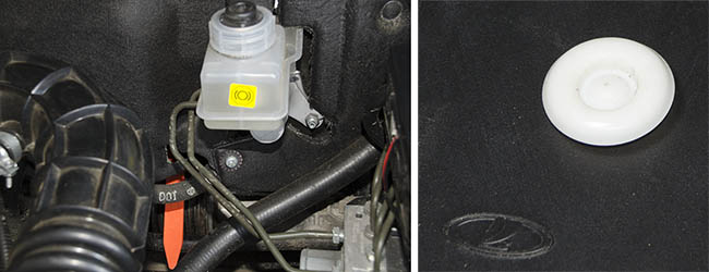 Проход в подкапотное пространство LADA Priora NEW осуществляется через штатное отверстие в левой стороне переборки над педалью акселератора – место прохода отмечает пластиковая лопатка. Оно закрыто белой пластиковой заглушкой, которую надо будет снять. Провода необходимо протянуть через отверстие и установить заглушку на место.