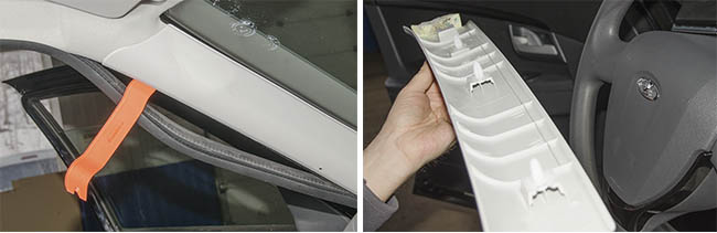 Перед тем как приступить к демонтажу нижней части торпеды LADA Priora NEW, снимем пластиковую накладку левой передней стойки для дальнейшей прокладки кабеля RF-модуля сигнализации Pandora LX 3050. Накладка крепится на трех клипсах. Частично сняв уплотнитель двери, аккуратно убираем накладку с помощью пластиковой фомки.