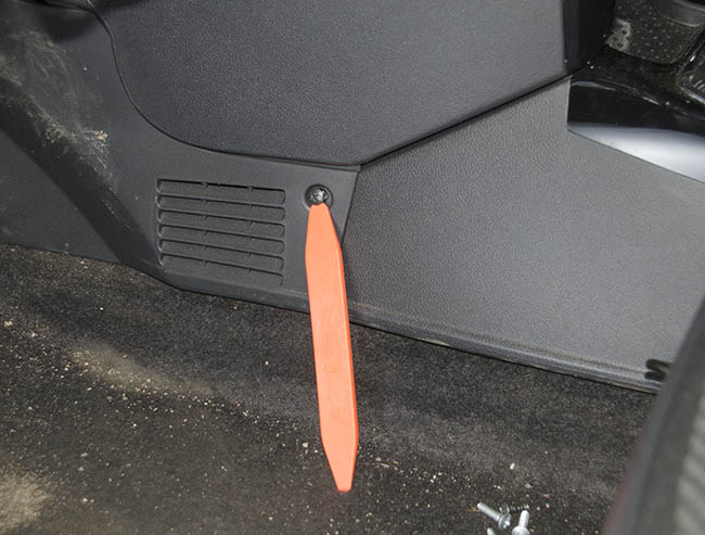 Чтобы открыть доступ к проводке автомобиля и блоку управления электрооборудованием кузова (BCM) LADA Priora NEW нужно снять пластиковую накладку центральной консоли вблизи педали газа. Для этого надо открутить один саморез и потянуть накладку вниз, чтобы вынуть фиксаторы из пазов.