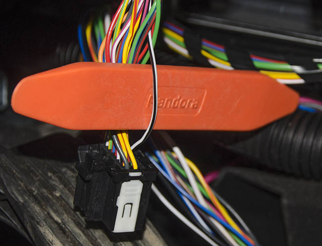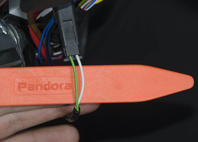 И, наконец, в этом же разъеме подключается уникальная функция, реализованная в сервисно-охранном комплексе Pandora LX 3050 – это подсоединение к LIN-интерфейсу автомобиля. В данном случае это синий провод с белой полосой. К нему нужно подключиться в разрыв. Белый провод сигнализации подключается ближе к разъему, провод черного цвета – к противоположному участку цепи.