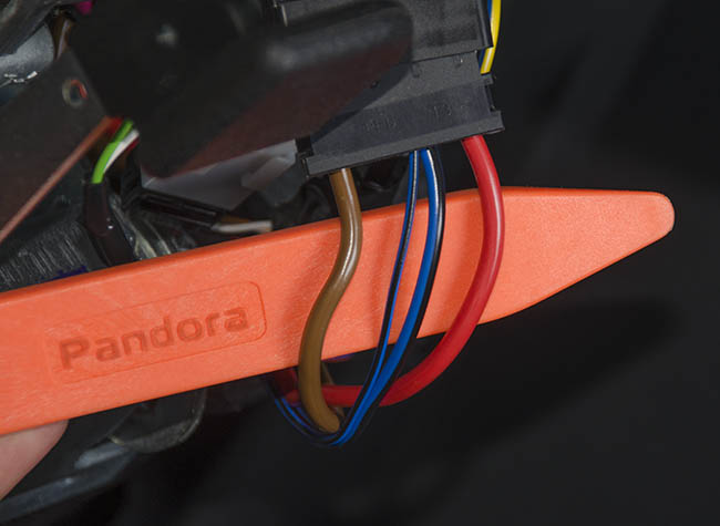 Разъем замка зажигания LADA Priora NEW. К нему подключается автозапуск. Коричневый провод – это постоянный плюс (+12В). Здесь будет осуществляться питание сигнализации Pandora LX 3050. Красный провод – это стартер. Два синих провода с черной полосой (тонкий и толстый) – это зажигание. Они подключены параллельно, поэтому если есть необходимость подключиться «в разрыв», необходимо их разрезать, соединитьвместе и подключить по схеме зажигания «в разрыв».