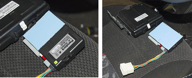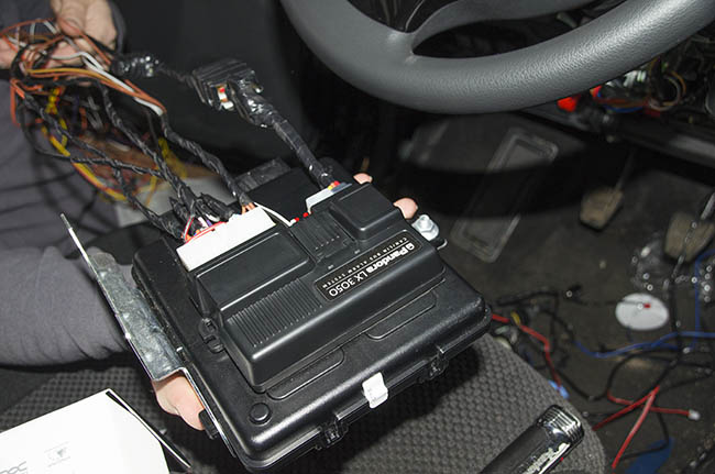 В верхней части за накладкой центральной консоли в области педали газа скрытно расположен блок управления электрооборудованием кузова. Он закреплен на металлической рамке и имеет четыре разъема. В дальнейшем блок управления кузовным электрооборудованием будет снят для продолжения монтажа сигнализации.