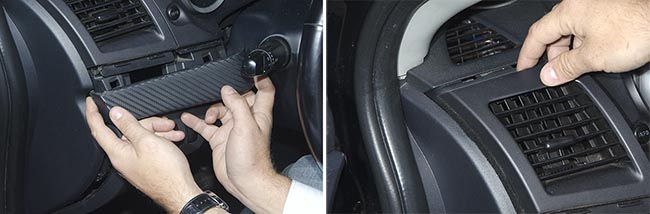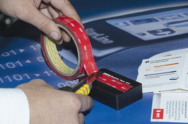 Когда настройки завершены, приклеиваем двусторонний скотч, чтобы закрепить маяк под передней панелью автомобиля.