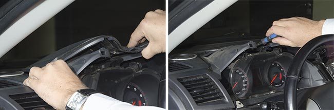 Чтобы добраться до пространства за магнитолой, необходимо частично разобрать приборную панель Mitsubishi Lancer. Для этого надо также снять бартачок и затем разобрать часть панели.