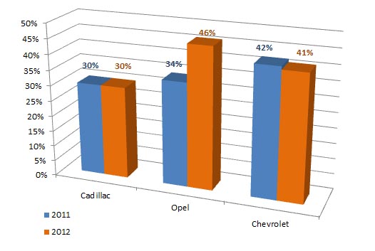 Среди марок Gerenal Motors также наблюдается стабильность предпочтений по кредитам, характерная для рынка автомобилей с пробегом. Выбивается только Opel. Так, "доля кредитов для автомобилей Cadillac и Chevrolet держится стабильно, на том же уровне. Что касается марки Opel, то за последний год процент кредитных автомобилей увеличился на 12%", - комментирует покупательские предпочтения Людмила Щемелинина.