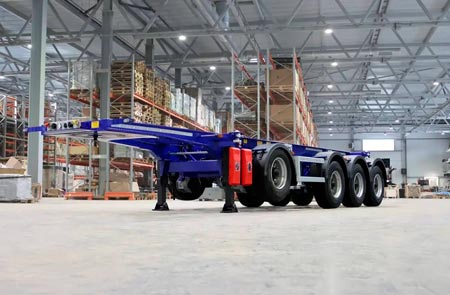 Полуприцеп оснащен усиленной рамой, выполненной из высокопрочной стали, рассчитанной на повышенные статические и динамические нагрузки. Это позволяет учитывать специфику танк-контейнеров, где важна не только масса груза, но и его поведение при движении, включая инерционные колебания жидкости.