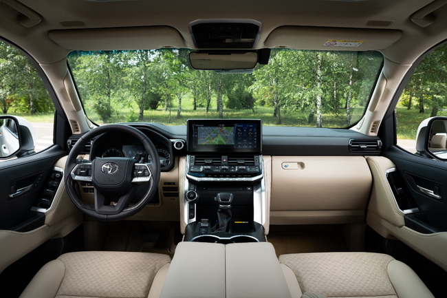 Новое поколение Toyota Land Cruiser 300 отличается стильным интерьером с продуманной компоновкой и престижными материалами отделки. Дизайн с первого взгляда передает ощущение безопасности и основательности благодаря широкой центральной консоли и характерной форме передней панели, позволяющей лучше ориентироваться в пространстве при движении по бездорожью. Интерьер доступен в следующих вариантах цветового решения на выбор: черный и бежевый салон в комплектациях Элеганс и Комфорт+, а также двухцветный черно-красный в версии 70th Anniversary.