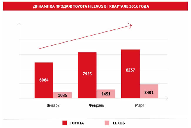 В течение первых трех месяцев 2016 года продажи компании «Тойота Мотор» на российском автомобильном рынке планомерно росли, несмотря на общую негативную динамику рынка. В январе 2016 компанией было реализовано 7 149 автомобилей Toyota и Lexus, в феврале – 9 404 автомобиля (+32 % по сравнению с январем 2016 года), в марте – 10 638 автомобилей (+13 % по сравнению с февралем 2016 года).