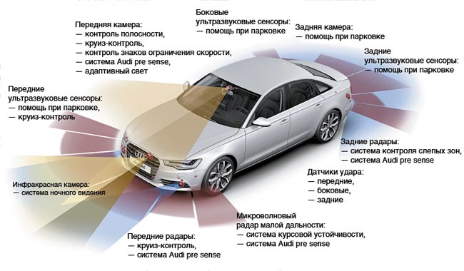 Фирма Audi поделилась с журналистами своими наработками в области технологий, помогающих человеку справляться с управлением автомобиля. Электроника не будет управлять машиной на 100%, но будет помогать и контролировать водителя.