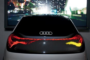 В отличие от BMW, применять лазеры в фарах Audi не планирует. Но им нашлось место в задних противотуманных фонарях - широкий луч отлично виден в дымке, а черта на земле предупреждает водителей о безопасной дистанции (расстояние зависит от скорости).