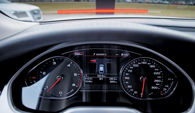Другой проект - система Intersection assistant, облегчающая выезд на «слепой» перекресток проработана лучше. За всю презентацию она ни разу не ошиблась! Если попытаться выехать наперерез приближающейся машине, перед глазами водителя на лобовом стекле появится большая ярко-красная «стоп-линия» - психологически действует весьма доходчиво. Дисциплинирует! Примечательно, что система не только заглядывает за угол широкоугольными камерами бокового обзора в бампере, как это происходит на автомобилях BMW и Lexus. Главная роль возложена на пару радиолокационных датчиков, а в будущем, как и в системе RTTI у BMW, - на обмен информацией между машинами на дороге по радиоканалу (через пару лет стандарт Automotive WLAN 802.11p должен стать единым для всех европейских и американских автопроизводителей). Правда, как Intersection assistant будет работать на практике в плотном московском потоке, двигающимся против всех правил - загадка.