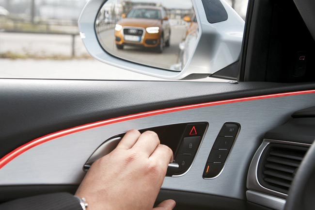А это некое дополнение к Intersection assistаnt. Через год это система уже будет доступна на серийных машинах! Если при остановке попытаться открыть дверь перед приближающимся сбоку автомобилем, загорится предупреждающий треугольник возле ручки и встроенная в обшивку полоска, но дверь при этом не заблокируется, в надежде на сознательность владельца.