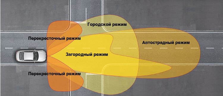 Кругозор системы Intersection assistаnt. В зависимости от режима движения.
