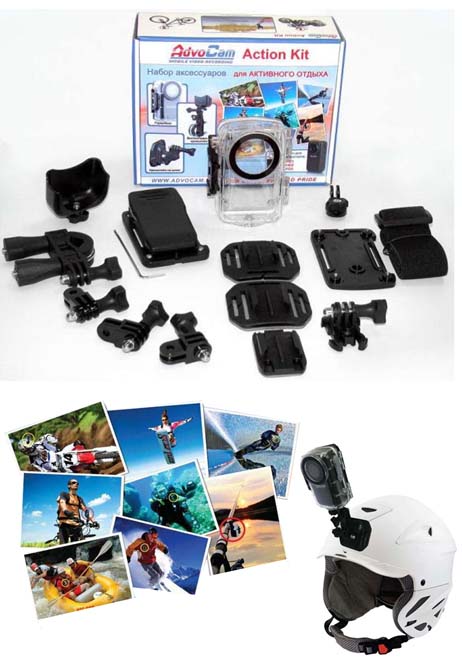 Существует также продающийся отдельно набор аксессуаров «Action Kit» для любителей экстрима и просто активного отдыха. В него входит гермобокс, который позволяет не бояться снега и дождя, а также погружаться с камерой на глубину до 20 метров и множество разнообразных креплений с технологией 3M - на металл, стекло и пластик (в том числе, на велосипед, мотоцикл, удочку/спининг, а также на различные шлемы: сноубордистов, лыжников, велосипедиситов, мотоциклистов). Использование этого набора превращает регистратор AdvoCam в полноценную мобильную камеру. Набор подходит для всех трех устройств AdvoCam. Цена «Action Kit» - 2 900 рублей.