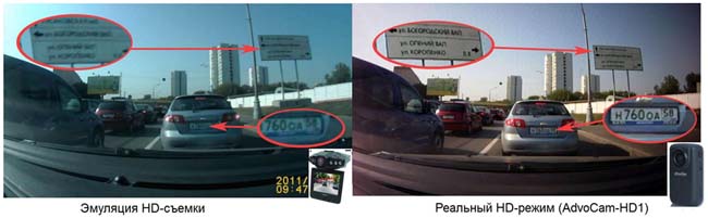 Разница между реальным HD-режимом и эмулированным. Для сравнения: видео, снятое регистратором с интерполяцией и видео, записанное регистратором AdvoCam-HD1 с реальным разрешением 720р.