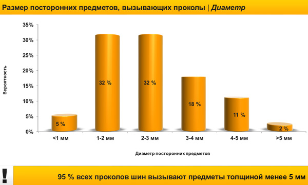 - 95 % всех проколов шин вызывают предметы толщиной менее 5 мм;