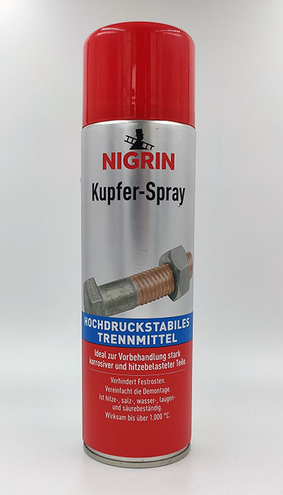 Медная смазка немецкого производства Nigrin Kupfer-Spray лишь на четверть балла опередила предыдущего участника рейтинга. Состав также не очень хорошо выступил в «рейтинге этикеток», хотя на него было нанесено побольше информации о составе. Nigrin Kupfer-Spray показал средние позиции в качестве покрытия металлической пластины. Причем его состав очень был похож на состав другой немецкой марки Wurth и по цвету и по запаху и по структуре материала.