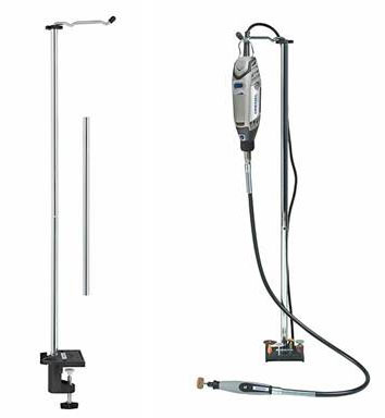 Штатив надежно закрепляет инструмент Dremel над верстаком и является по-настоящему незаменимым для работ с гибким валом. Штатив легко закрепляется на рабочей поверхности толщиной до 42 мм и регулируется по высоте от 300 до 1070 мм. Часто используемые насадки можно разместить на специальной подставке. Штатив прекрасно подходит для продолжительных работ. Рекомендуемая стоимость 1 219 рублей
