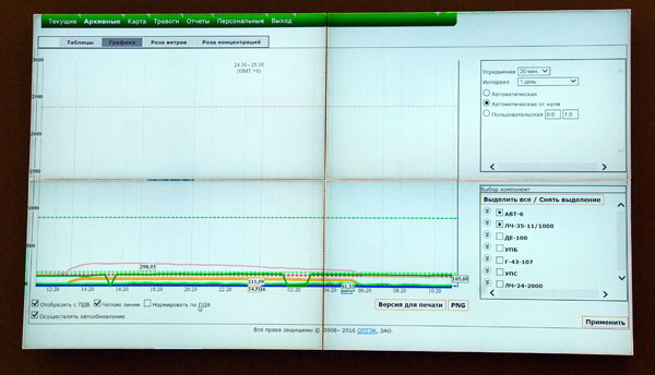На самый большой монитор в зале выводятся данные экологического мониторинга атмосферы.