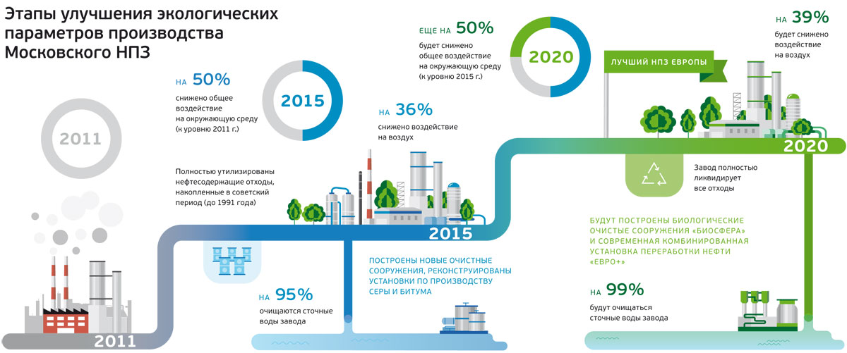 Так что же произошло? В 2015 году был завершен первый этап реконструкции Московского нефтеперерабатывающего завода, который был начат в 2011 году. За этот период на предприятии удалось уменьшить на 36% объем вредных выбросов в воздух и повысить на 95% эффективность очистки сточных вод от загрязняющих веществ, а также ликвидировать все загрязняющие территорию завода отходы, копившиеся с первых лет эксплуатации. Общее снижение воздействия на окружающую среду специалисты предприятия оценивают как 50%.