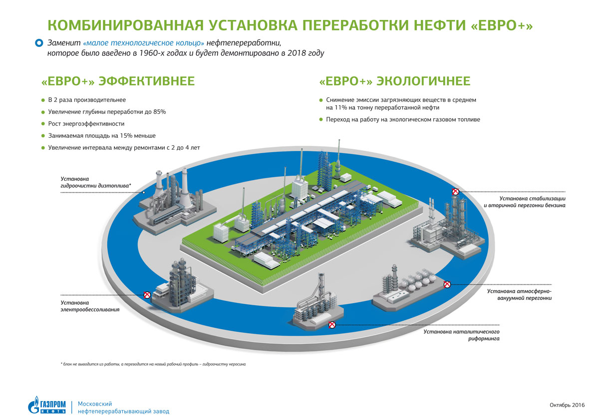 Второй этап реконструкции будет включать в себя возведение и запуск комбинированной установки «Евро+». Ввод в эксплуатацию «Евро+» позволит МНПЗ увеличить выход светлых нефтепродуктов, перейти на четырехлетний межремонтный пробег, улучшить показатели энергоэффективности и дополнительно сократить воздействие на окружающую среду.