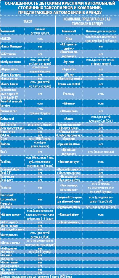 Мы обзвонили ряд таксопарков, а также компаний, предлагающих автомобили в аренду, и задали вопрос, могут ли они предоставить автомобиль с детским креслом. И если да, то для всех ли возрастных групп детей имеются кресла. Ситуация такова: конечно, есть компании, где позаботились о маленьких пассажирах, но их немного. В тех фирмах, где могут предоставить детские кресла, частенько есть не все группы либо есть одно или два и в данный момент они заняты. Большинство диспетчеров даже не знают, что кресла делятся на группы в зависимости от веса и возраста ребенка. В одной из компаний ответили, что они принципиально не ставят детские кресла, поскольку они сильно отличаются друг от друга по безопасности, и в случае чего все претензии якобы будут адресованы к ним. А если 5‑летний пассажир будет ехать на штатном автомобильном сиденье, значит все нормально? Где логика - непонятно! Не желают пока в России предприниматели заботиться о своих клиентах...