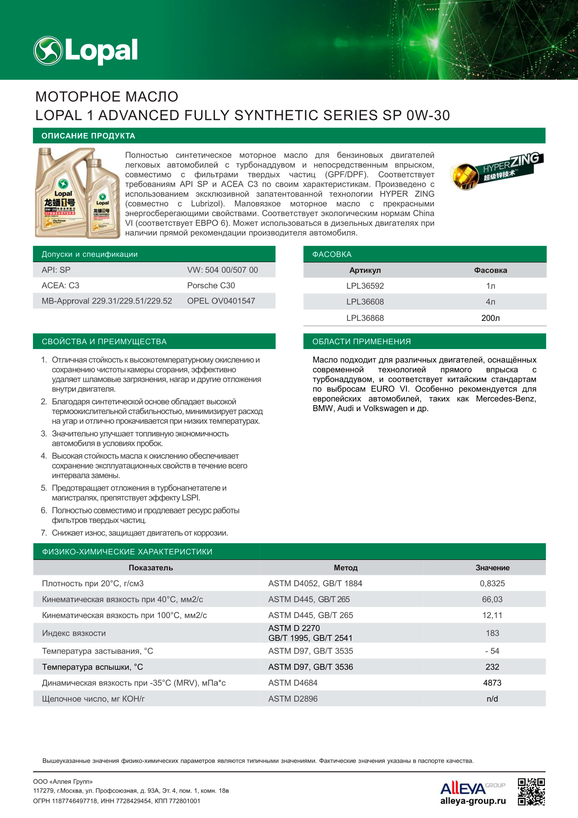 Lopal 1 Advanced Fully Synthetic Series SP 0W-30 – обзор паспортных характеристик