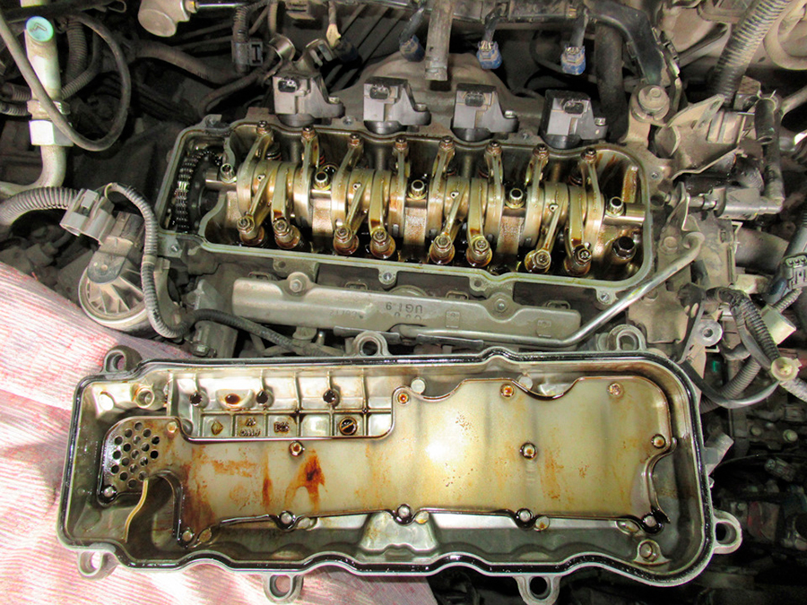 На стенках клапанной крышки, кулачках клапанов и других деталях двигателя остается старое масло.