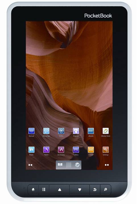 ОБЗОР МОДЕЛИ ОСОБЕННОСТИ КОНСТРУКЦИИ: дизайн планшетника PocketBook A7" 3Gвыглядит эксклюзивным, такую эргономичную конструкцию мы не встречали ни в одном планшете или TFT-ридере. Выделяется эффектное сочетание белого и черного цветов, причем поверхность совершенно не маркая. "Фишкой" PocketBook A7" 3Gявляется нижняя панель со специальной парой широких кнопок для листания. В альбомной ориентации часть корпуса с ней выгнута специально под большой палец. Вместо прямоугольной формы все торцы ридера скошены, поэтому он отлично ложится, а не "впивается" в ладонь. ТЕХНИЧЕСКИЕ ОСОБЕННОСТИ: Помимо поддержки 3G, планшет PocketBook A7" 3Gможет похвастаться наличием оптимального "железа" в виде процессора TI OMAP 3621 с частотой 1 ГГц, 512 Мб оперативной памяти и 4 Гб для хранения файлов. Отметим наличие фронтальной 2-мегапиксельной камеры для видеосвязи в Skype. При емкости аккумулятора на 3300 мАч ридер обеспечивает около 8 часов чтения и смешанный режим работы до шести часов, что очень неплохо. У 7-дюймового экрана PocketBook A7" 3Gвысокое разрешение 1024х600 пикселей. МУЛЬТИМЕДИА И ЧТЕНИЕ ЭЛЕКТРОННЫХ КНИГ: для чтения в ридере PocketBook A7" 3Gпредустановленна как собственная читалка-каталог PocketBook, так и популярное приложение CoolReader, в сравнении с другими ридерами, буквы прорировываются более четко, без зернистости. Основным предназначением ридера, на наш взгляд, могло бы стать чтение журналов PDF. Благодаря высокому разрешению текст хорошо читаем даже без зума. Как следствие в альбомной ориентации поддержкой мультитач пользоваться почти не пришлось. Если же приходилось активно увеличивать-уменьшать участки, прорировка осуществлялась за 1-2 секунды. Выигрывает экран с высокой плотностью пикселей и при просмотре DVDrip. Работа в Интернете в браузере Dolphin Browser HD примечательна отсутствием задержек в скролле, даже при наличии на странице Flash-анимации. РЕЗЮМЕ ДОСТОИНСТВА: специальная панель кнопок для чтения, нетривиальный дизайн, эргономичный корпус, высокое разрешение экрана, поддержка Skype и видеочата, длительная автономная работа. НЕДОСТАТКИ: нет поддержки GPS, отсутствует тыльная камера. ОБЩАЯ ОЦЕНКА: PocketBook A7" 3G - сбалансированный ридер-планшет, удививший нас крайне продуманным дизайном и конструкцией корпуса – вкупе с HD-экраном и хорошей батареей, А7 3G сочетает в себе как внешнюю привлекательность, так и внутреннюю функциональность. PocketBook A7" 3G – планшет для чтения книг и просмотра мультимедиа, обзор