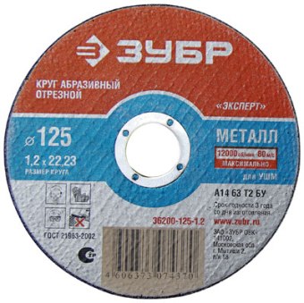 РЕЗУЛЬТАТЫ ТЕСТА Диаметр после 50-ти резов, мм: 108,5 Коэффициент эффективности, 50 резов: 1,81 Соотношение качество (коэффициент эффективности реза) / цена: 0,100 С первого взгляда отрезной диск «ЗУБР Эксперт» не вызывает доверия и производит грустное впечатление. Материал диска, армирующая сетка грубая, нечеткая. Даже визуально диск толще нормы. Оформление диска также вызывает целый ряд вопросов. Во-первых, отсутствует значок ГОСТа, во-вторых указаны более низкие максимально допустимые обороты – 12200 вместо 12250 об/мин. Во-вторых, в качестве производителя указан г.Мытищи, однако там производство абразивной продукции отсутствует как класс. Но есть и более серьезные отклонения. Так толщина (высота) отрезного диска ЗУБР Эксперт не укладывается в требования ГОСТ 21963 и при заявленной толщине в 1,0 мм по факту достигает 1,55 мм, при положенных по ГОСТ максимальному отклонению в 0,2 мм. Также нарушены требования ГОСТ по неравномерности диска. Стандарты требуют, чтобы она не превышала 0,1 мм, в то время как в этом образце неравномерность составляет 0,18 мм. Несмотря на отклонения от требований стандарта тест на скорость минимального разрушения отрезной круг «ЗУБР Эксперт» успешно прошел. Результаты теста по резу металла ничем нас не порадовали: станок останавливался дважды, на 17 и 19-м резе. Поскольку усилие, прикладываемое на диск, на станке ограничено, то в случае «закусывания» он просто останавливается. Такие остановки означают, что круг плохо врезается в металл, туго идет. По результатам 50-ти резов внешний вид диска ЗУБР Эксперт произвел удручающее впечатление: произошло осыпание кромки, ее выкрашивание (выщербление), горение. Работать таким диском на ручной машинке будет крайне затруднительно. Но даже не смотря на такие проблемы по коэффициенту эффективности реза продукция «ЗУБР Эксперт» не является аутсайдером нашего теста, а занимает среднюю позицию при этом значительно отставая от лидеров. РЕЗЮМЕ Отрезной диск «ЗУБР Эксперт» имеет значительные отклонения от стандартов и низкую эффективность, при всем при этом место, где произведен это диск на этикетке не указано. ЗУБР Эксперт - диск отрезной к УШМ, тест