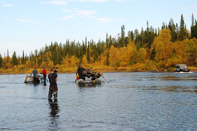 Далеко не всем удалось самостоятельно перебраться через эту северную речку: стремительное течение подхватывало машины и уносило вниз словно бумажные кораблики. Квадроциклы же переправлялись через Печу и вовсе верхом на катамаране. Надо сказать, течение на стремнине было таким, что два сильных опытных гребца едва вытягивали катамаран против течения.