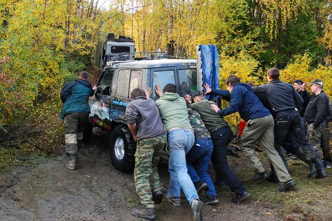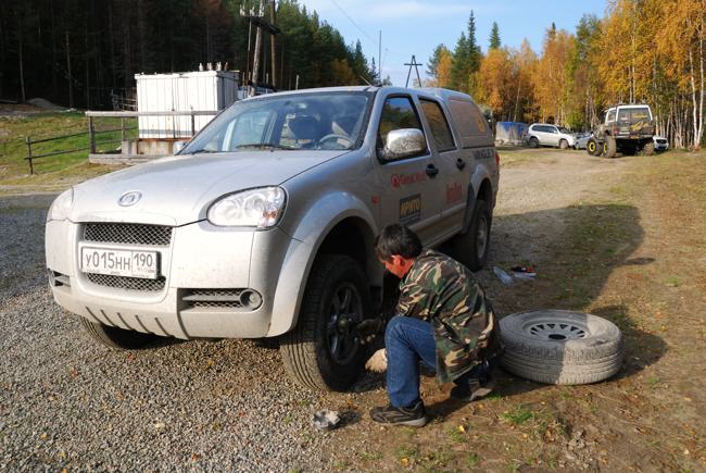 В то время как водные процедуры в реке Печа продолжались, «Арктик трофи» «для пузотерок» тоже приготовил нам очередной сюрприз. Паркуясь, мы наехали на что-то острое передним левым колесом. Веселый свист спускающего колеса нашего Вингла привлек внимание окружающих, и нас позвали поглядеть, что случилось. А случился всего лишь прокол: как началось для нас «Арктик трофи 2011» с приключений с колесами, так, похоже, и заканчивается.