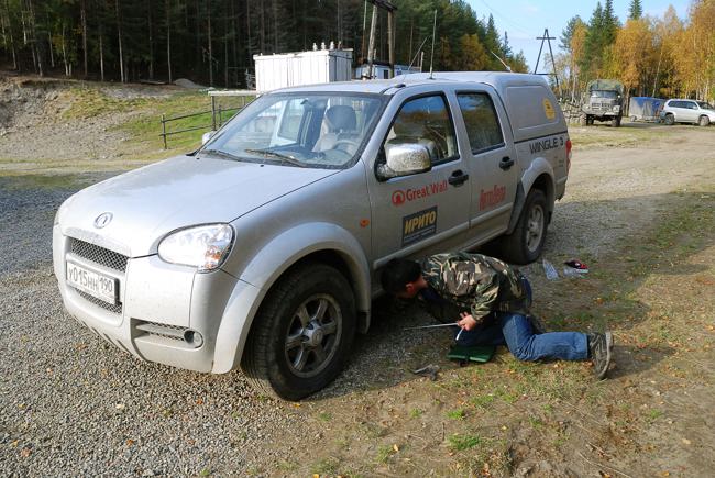 Запыленная запаска оказалась на штампованном диске. Литой красивый диск штатного колеса GW Wingle 3 не так элегантно садился в посадочное место крепежа запасного колеса. До посещения шиномонтажа просветка нашего китайского пикапа немного уменьшилась, зато машина приобрела бывалый боевой вид.