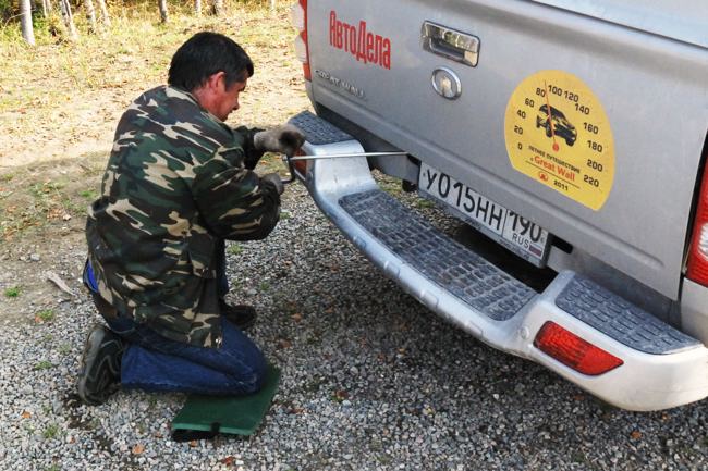 Андрей быстро нашел скважину, куда надо вставлять хитрый ключ для снятия запаски в нашем «китайце». Однако для меня эта задача оказалась не такой очевидной - Андрею пришлось показывать, как это делается.