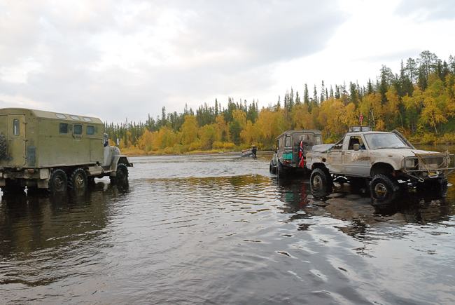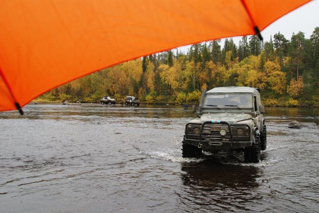 Пока Андрей перекидывал пробитое колесо, на противоположном берегу началась суета: из-за горизонта появился норвежский десант. Мы как раз успели вовремя к началу штурма. После изучения реки штурманами, первым пошел экипаж на Toyota LC 70 - выбрав нестандартную траекторию, он ловко перескочил реку. Однако пошедшему ровно за ним экипажу не повезло - машина оказалась легче японского пикапа, и коварное течение тут же подхватило и швырнуло машину на камни. Два других норвежских экипажа выбрали опробованный маршрут, но и им не повезло: в отличие от российских УАЗиков английские тонут медленнее, и на стремнине машины превращаются в кораблики.